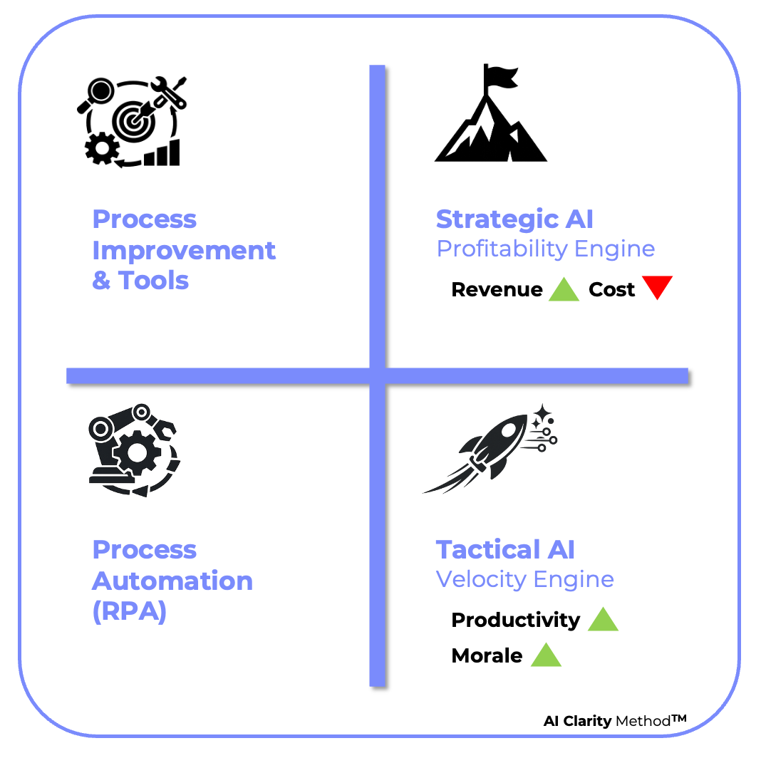 This is a Decision Framework, NOT a Tool. The AI Clarity Method™ helps enterprise leaders separate signal from noise and invest in AI initiatives that actually move the needle on revenue, cost, and competitive advantage.